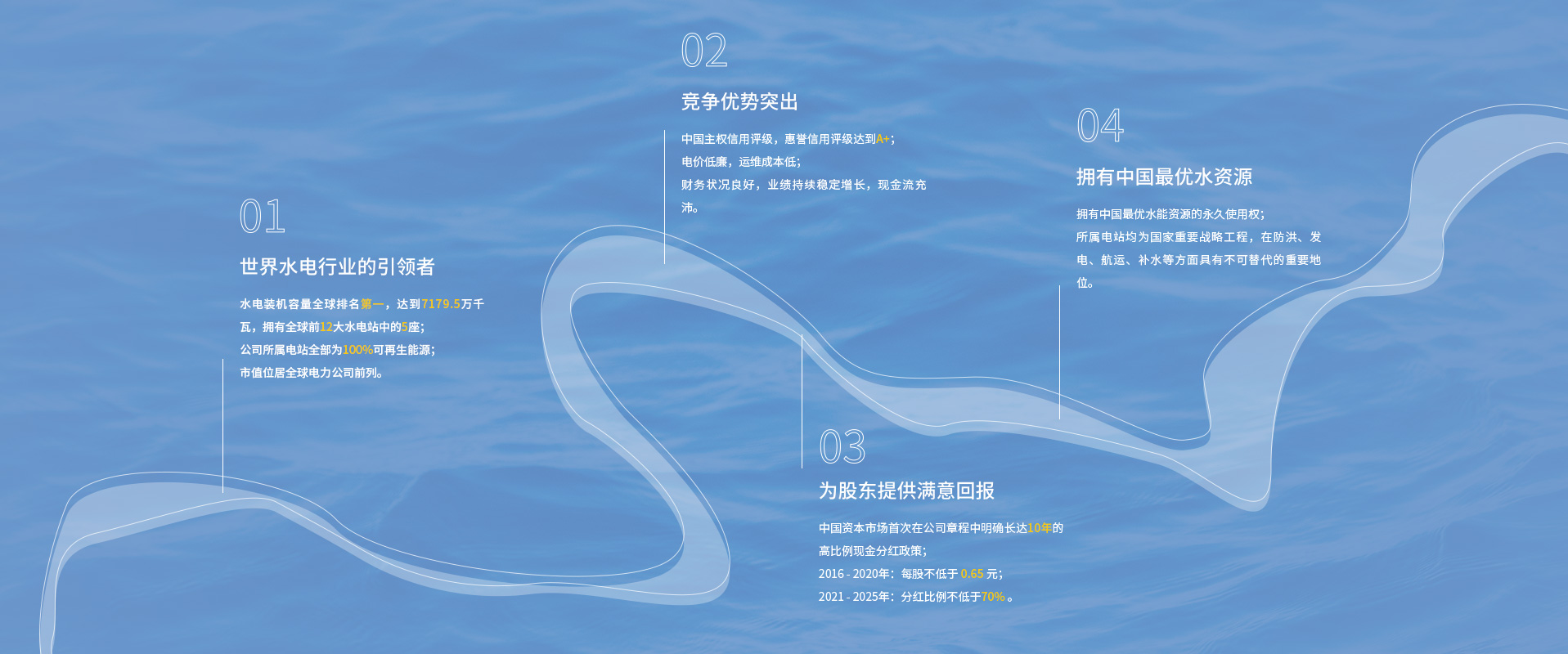 長江電力主要從事水力發(fā)電、投融資、抽水蓄能、智慧綜合能源、新能源和配售電等業(yè)務,經(jīng)營區(qū)域覆蓋中國、秘魯、巴西、巴基斯坦等多個國家,是中國最大的電力上市公司和全球最大的水電上市公司。長江電力運營管理的烏東德、白鶴灘、溪洛渡、向家壩、三峽、葛洲壩六座梯級電站,構(gòu)成了世界最大清潔能源走廊,有效保障了長江流域防洪、航運、補水和生態(tài)安全,為我國經(jīng)濟社會綠色發(fā)展提供了強勁動能。